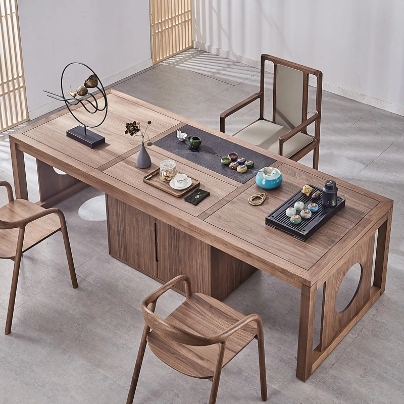Elegant Chinese Style Solid Wood Tea Table Set for Office - Kung Fu Tea Ceremony Table with Chairs, Made of Black Walnut - Perfect for Brewing and Enjoying Tea.
