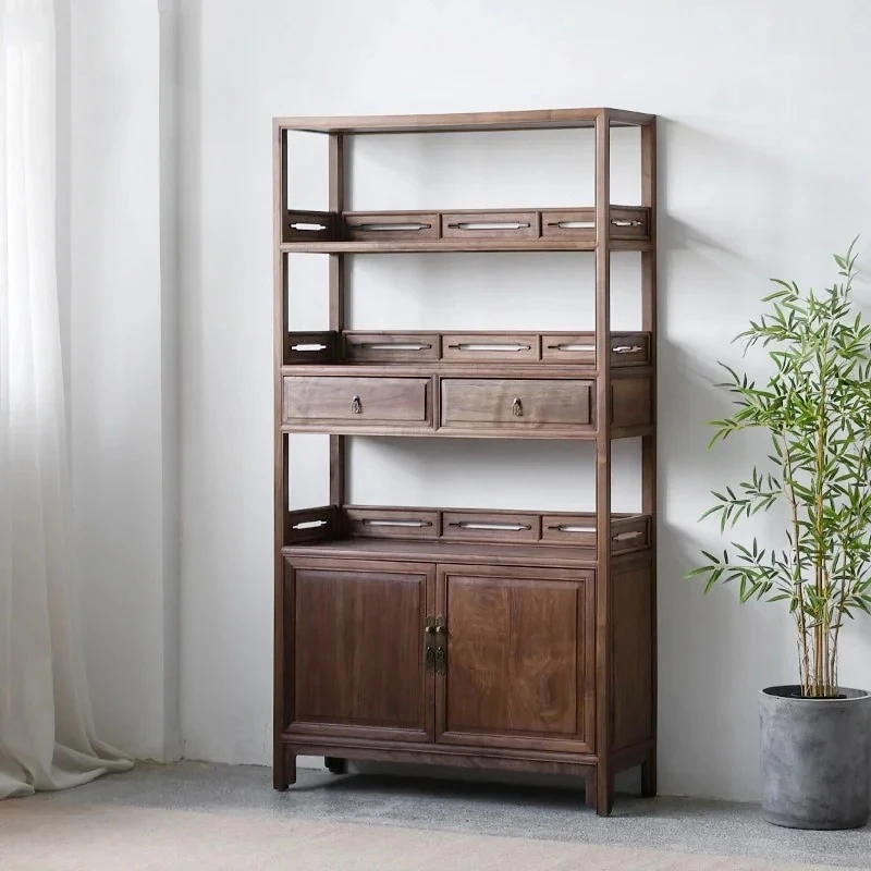 2025 New Style Walnut Wood Bookcase – Elegant Chinese Antique Display Shelf, Solid Wood Bookshelf, Tea Room Tea Cake Stand Combo