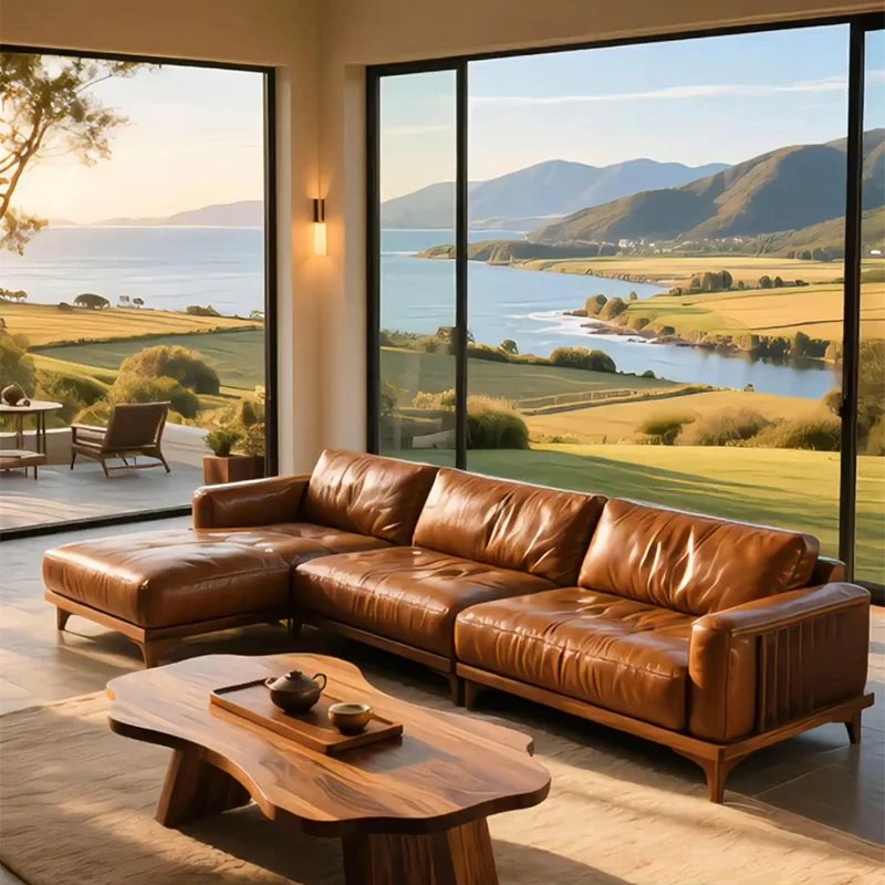 2025 New Chinese Style Solid Wood Sofa – Modern Minimalist L-Shaped Leather Corner Sofa Set for Home Living Room, Perfect for Comfort and Elegance