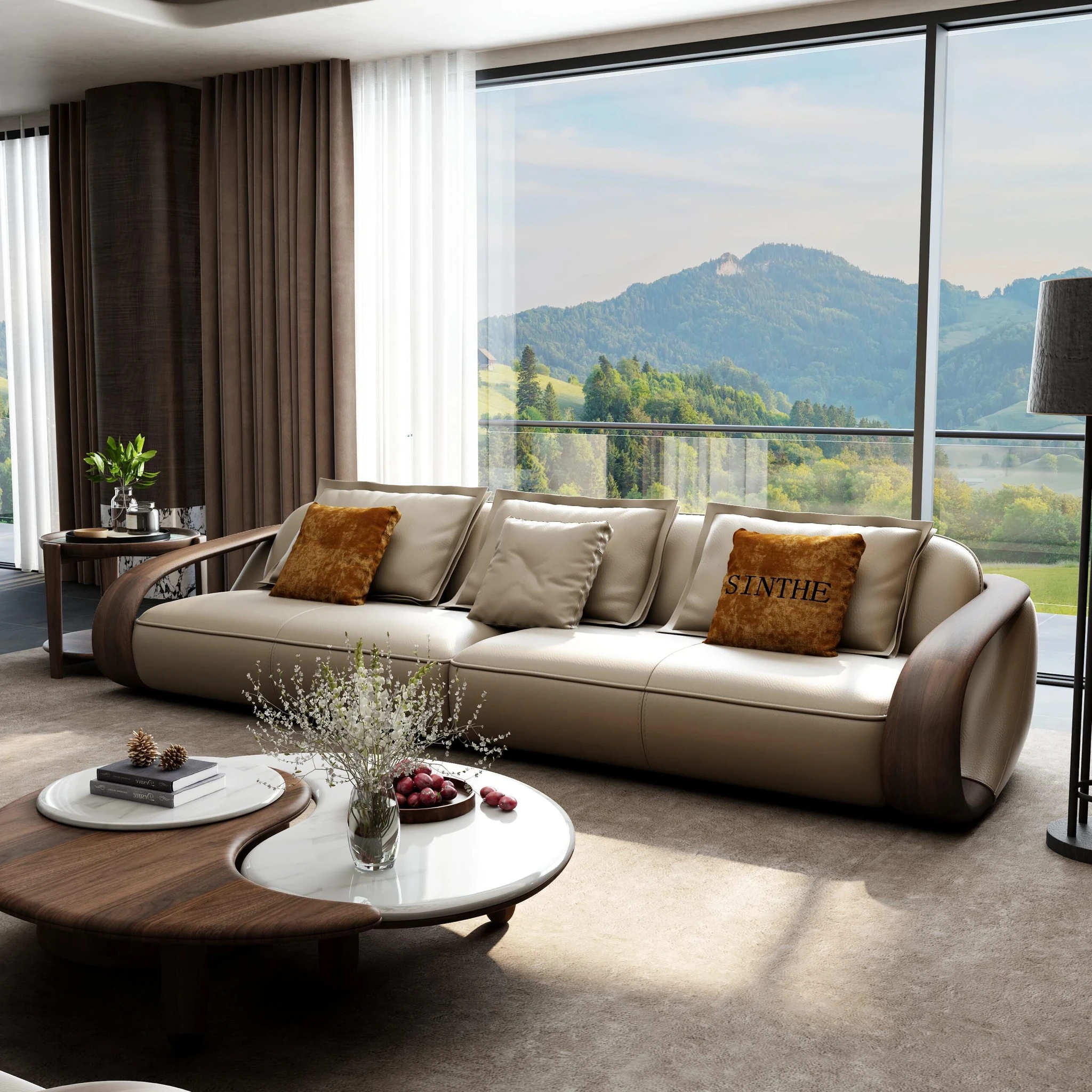 Italian Luxury Minimalist Solid Wood Sofa - High-End Leather Walnut Three-Seater for Living Room or Villa, Perfect for Modern Elegance