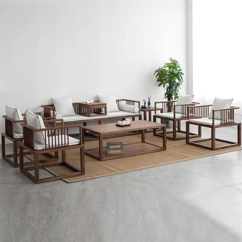 New Chinese Style Solid Wood Sofa - 2025 Modern Minimalist Walnut Veneer Upholstered Sofa for Home Living Room with Vintage Charm