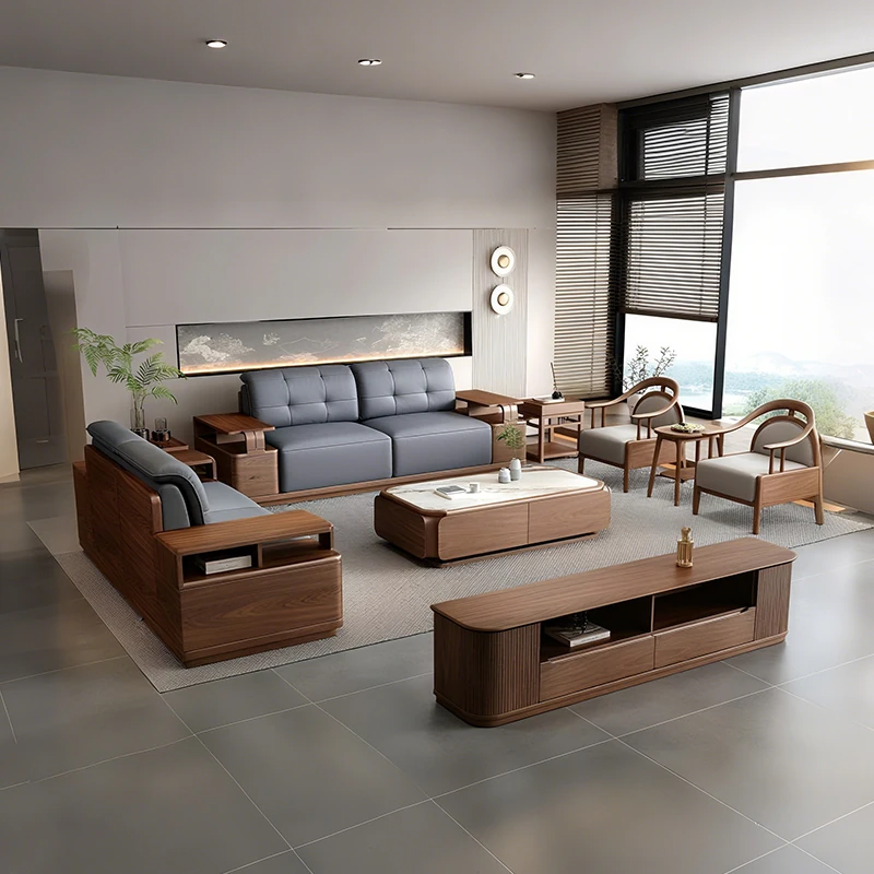 2025 New Style Chinese Solid Wood and Leather Sofa - Modern Minimalist Design for Home Living Room, Walnut Wood Finish