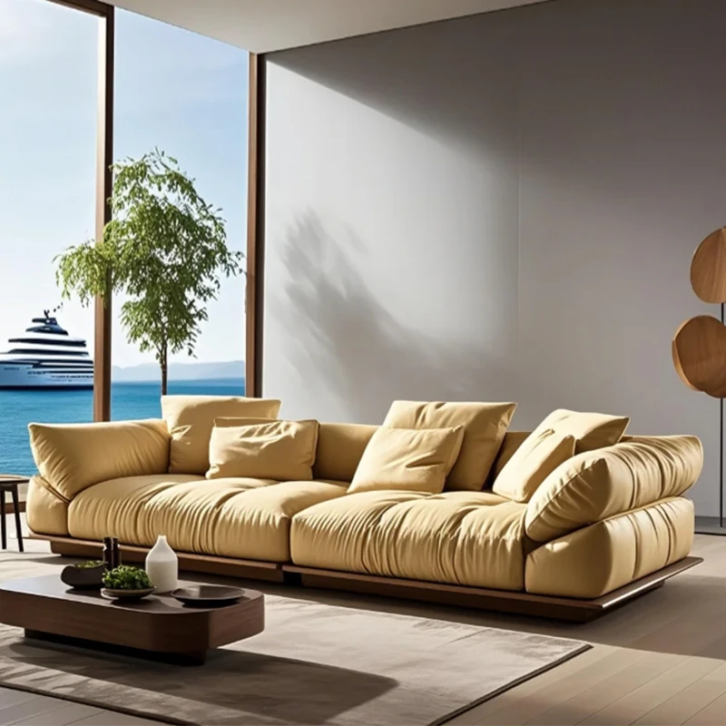 2025年新登场!新中式スタイルのイタリアンモダンミニマリズムソファ。家庭用の無垢材製、ウォールナットの皮革仕上げで、リビングにぴったりの直線デザイン。快適さと美しさを兼ね備えた一品をお見逃しなく!