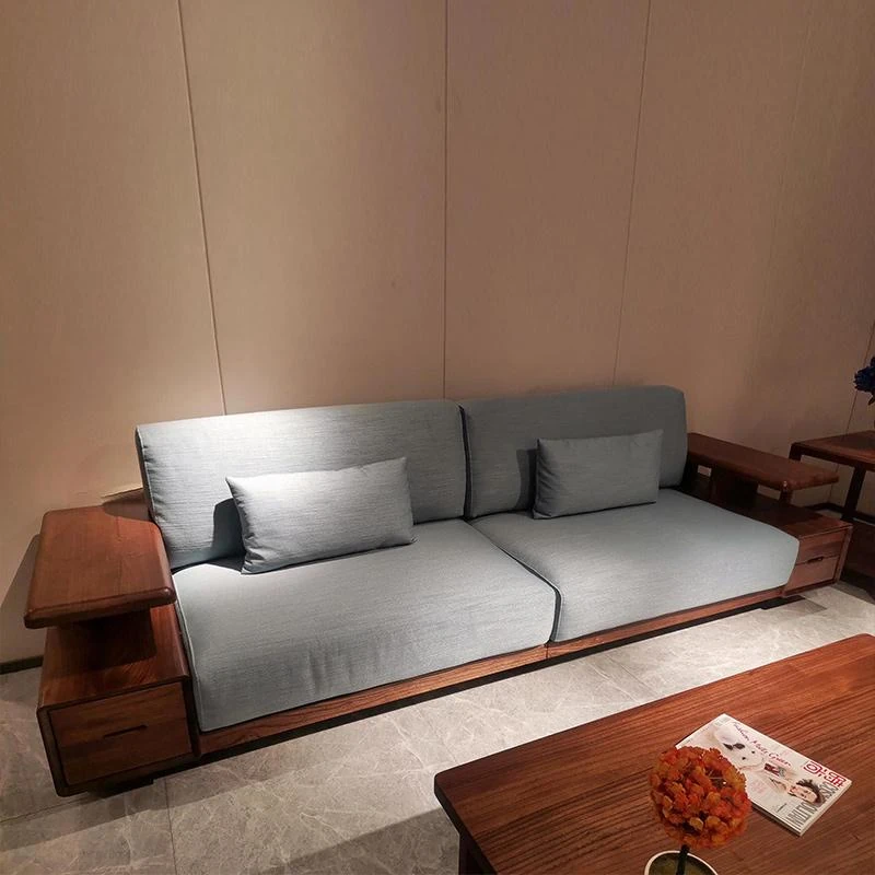 2025年新作!中古風の天然木製ソファ - モダンでシンプルなデザイン、家庭用リビングに最適な新中式のクルミの木と布製のソファ!快適さとスタイルを両立した一品です。