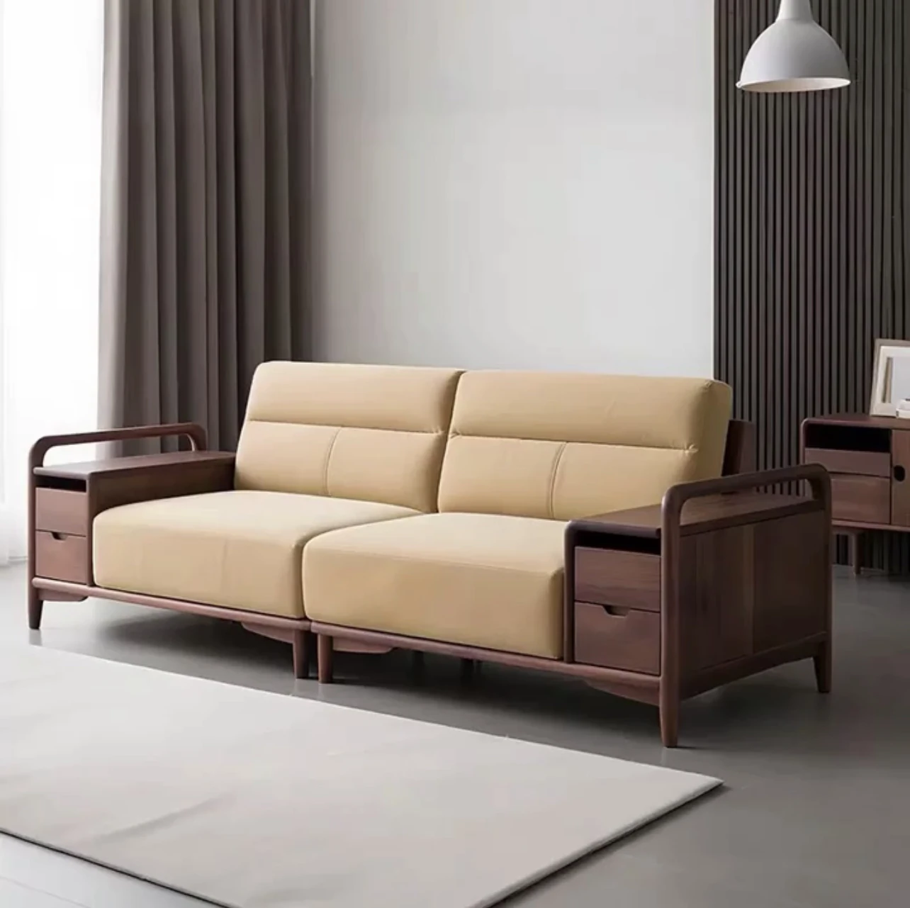 2025年新款新中式実木ソファー|現代的でシンプルなデザインのリビング用|ウォールナットの布張り・レザーソファーで、洗練された空間を演出!