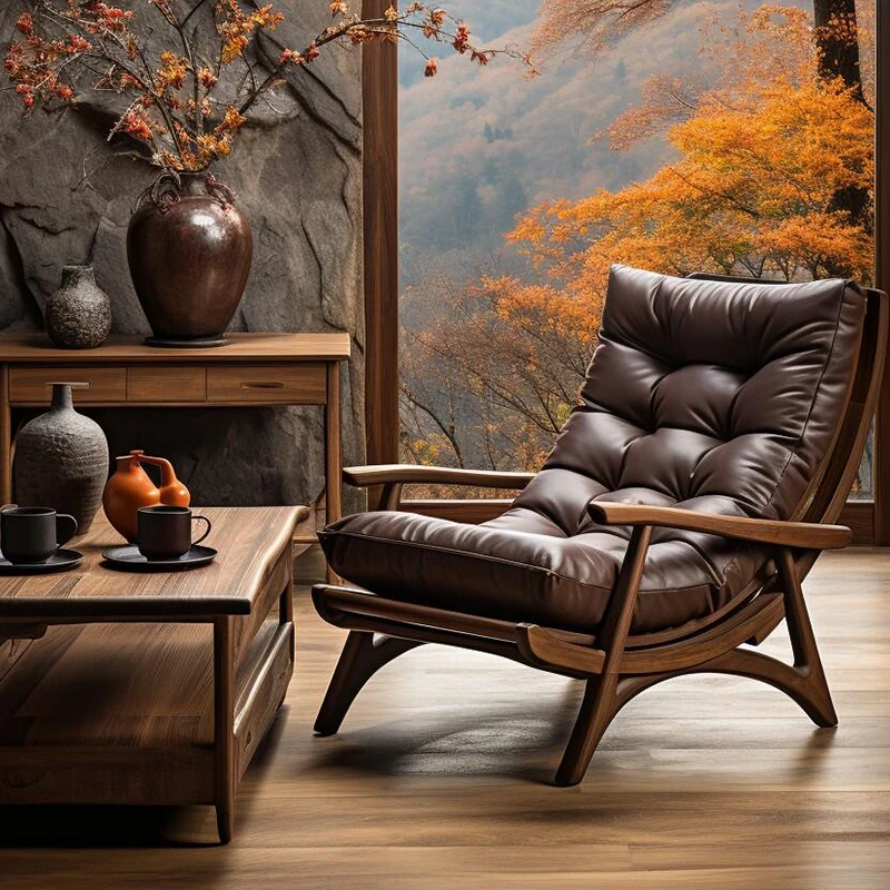 新中式デザインの無垢材ソファチェア|リビングにぴったりなモダンでシンプルな軽奢スタイル|高級感あふれるレザー仕上げの一人掛け椅子|美しいブラックウォールナット材使用で、心地よいくつろぎを演出します。