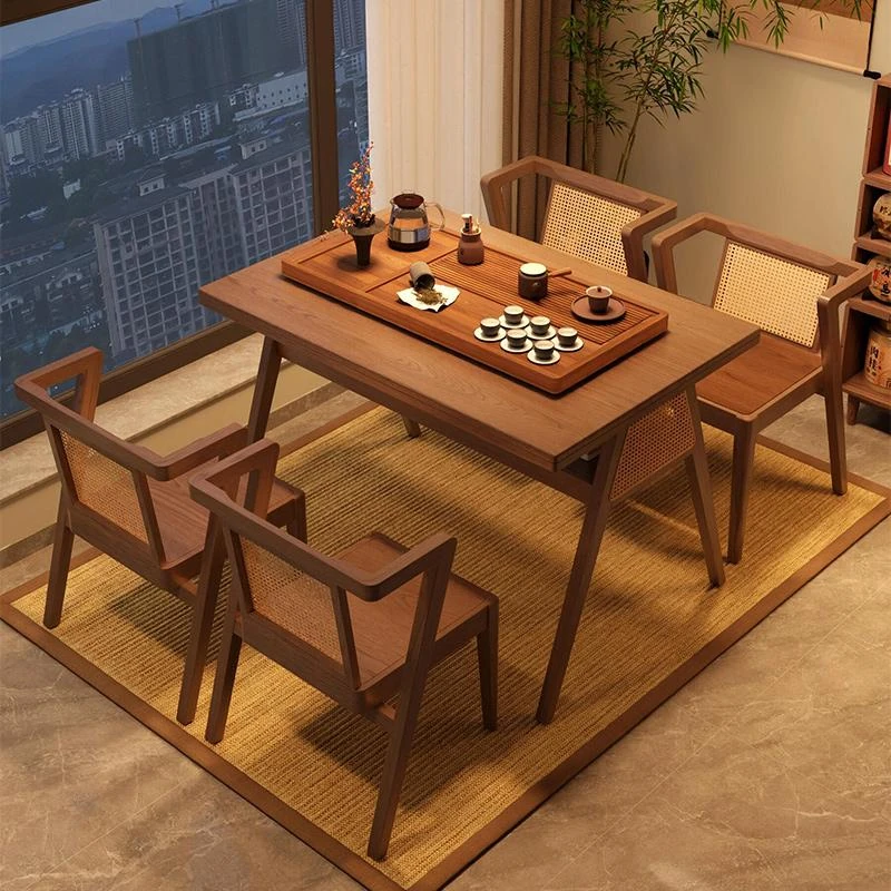 新中式風格の高級感ある実木茶卓と椅子のセット - 禅の心を感じるリラックス空間を演出!オフィスやティールームでの打ち合わせにも最適なデザイン。