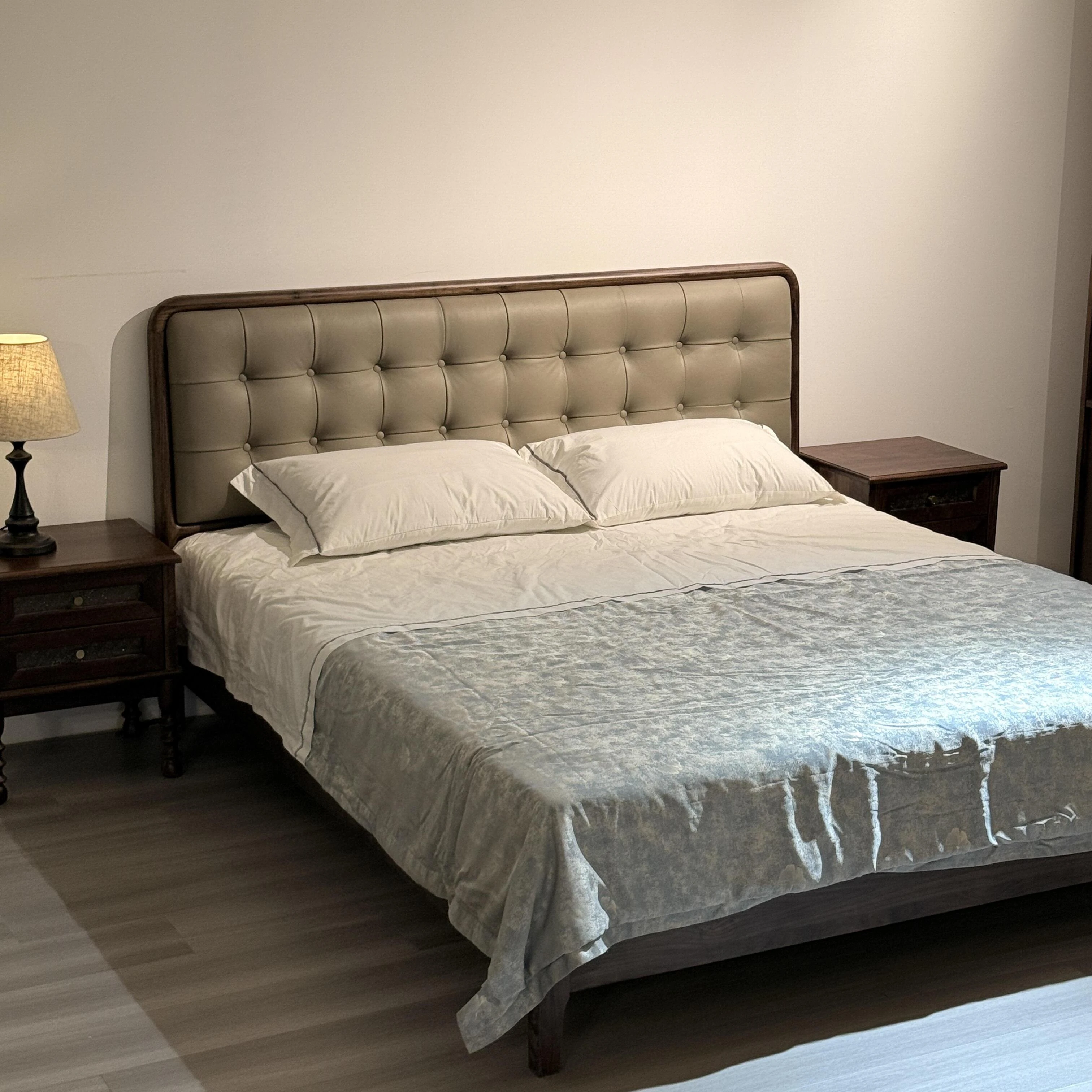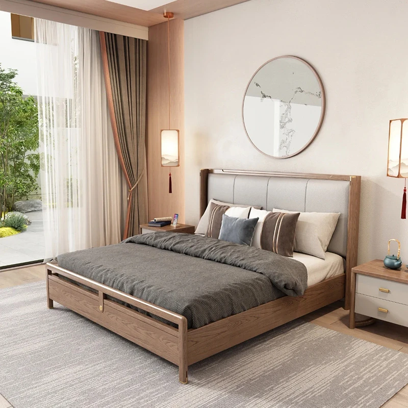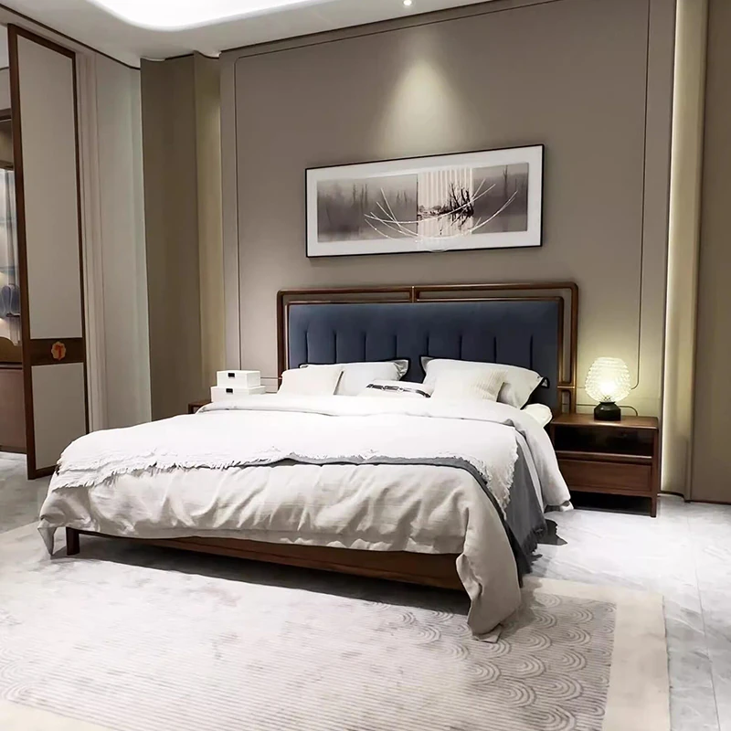 新中式デザインの無垢材ベッド2025年新作!モダンでシンプルな主寝室用ダブルベッド。別荘にぴったりのウォールナット材とレザー仕上げの婚礼用ベッドで、上質な睡眠をお楽しみください。