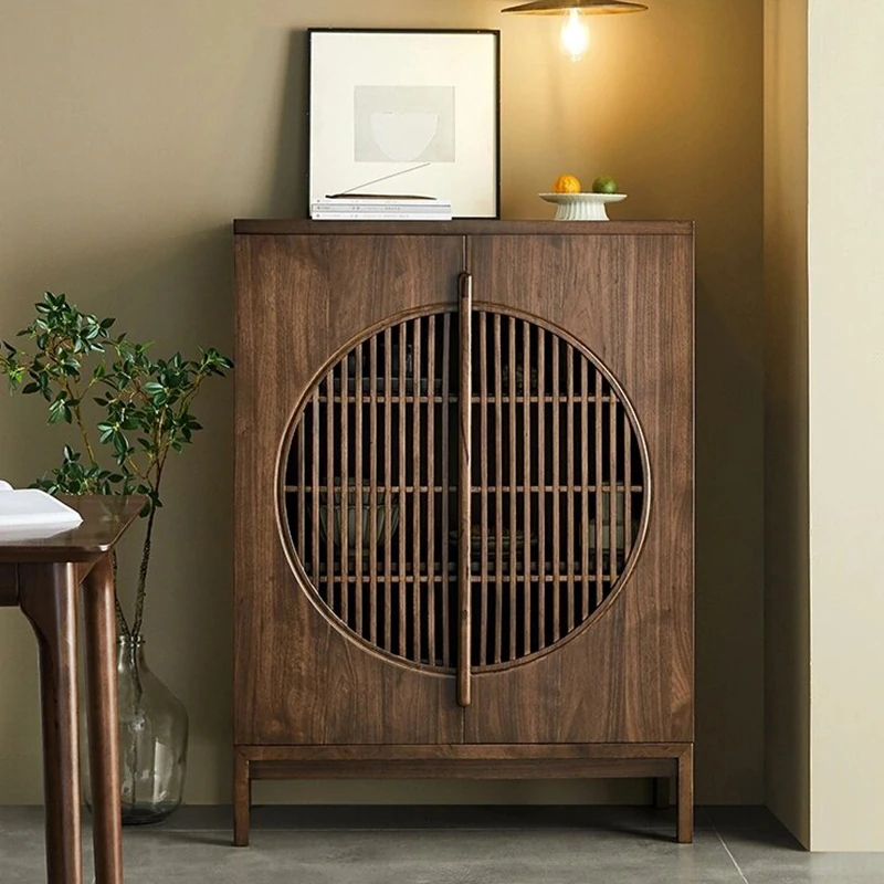 新中式スタイルのブラックウォールナット突き板玄関キャビネット - シンプルで禅の雰囲気を醸し出す、実木製のダイニングサイドキャビネット。リビングルームにぴったりな収納力抜群の二重扉デザイン!おしゃれで機能的な収納を手に入れましょう。