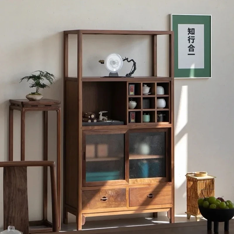 2025年新作!胡桃木製のシンプルな博古架 - 新中式デザインの茶葉展示棚。おしゃれな茶室にぴったりの多宝阁で、上質な茶器を魅せる理想の収納!