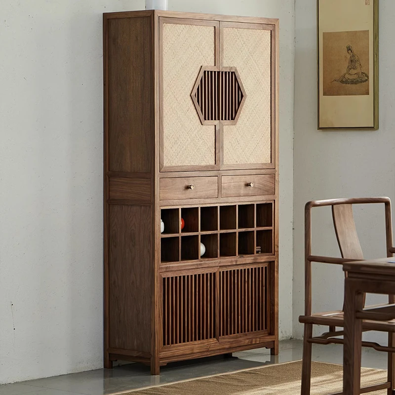 新中式スタイルの無垢材書棚2025年最新モデル!現代的でラグジュアリーな感覚を演出する、リビングルームにぴったりなクルミ材とラタン編みのオシャレなコレクションラック。あなたの空間をより魅力的に!