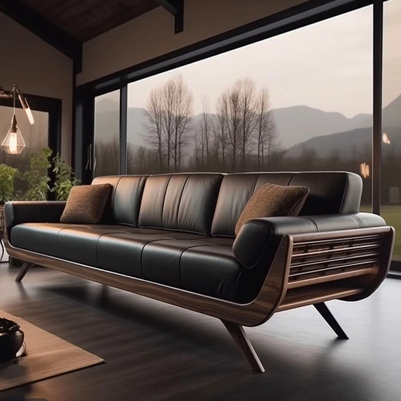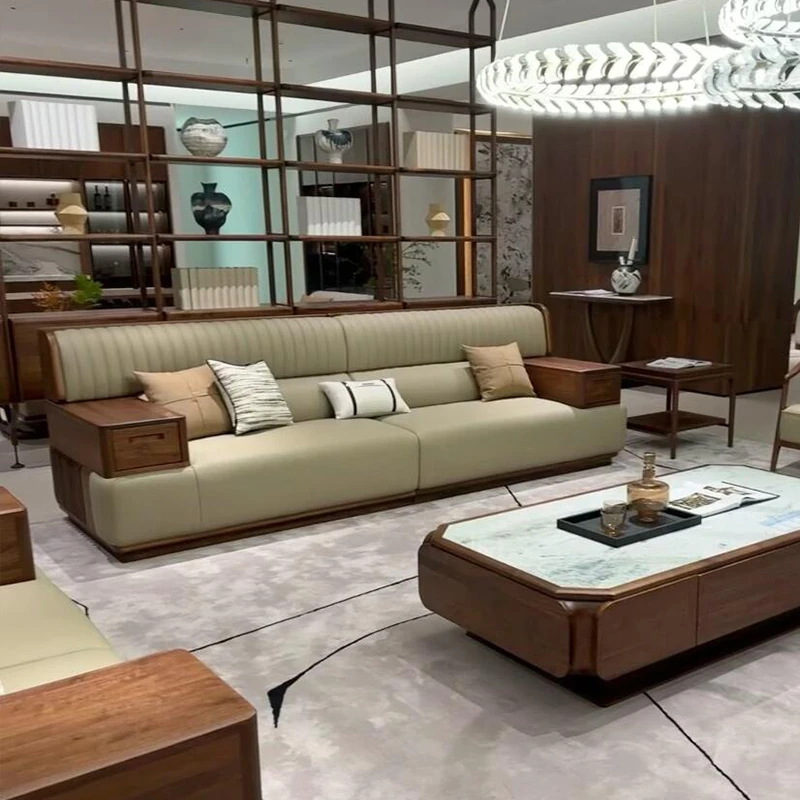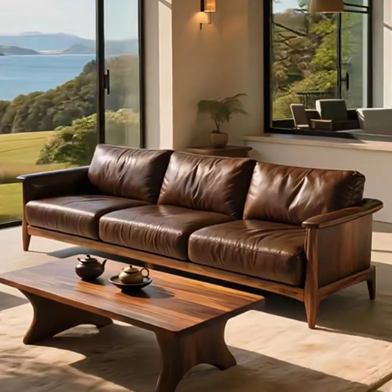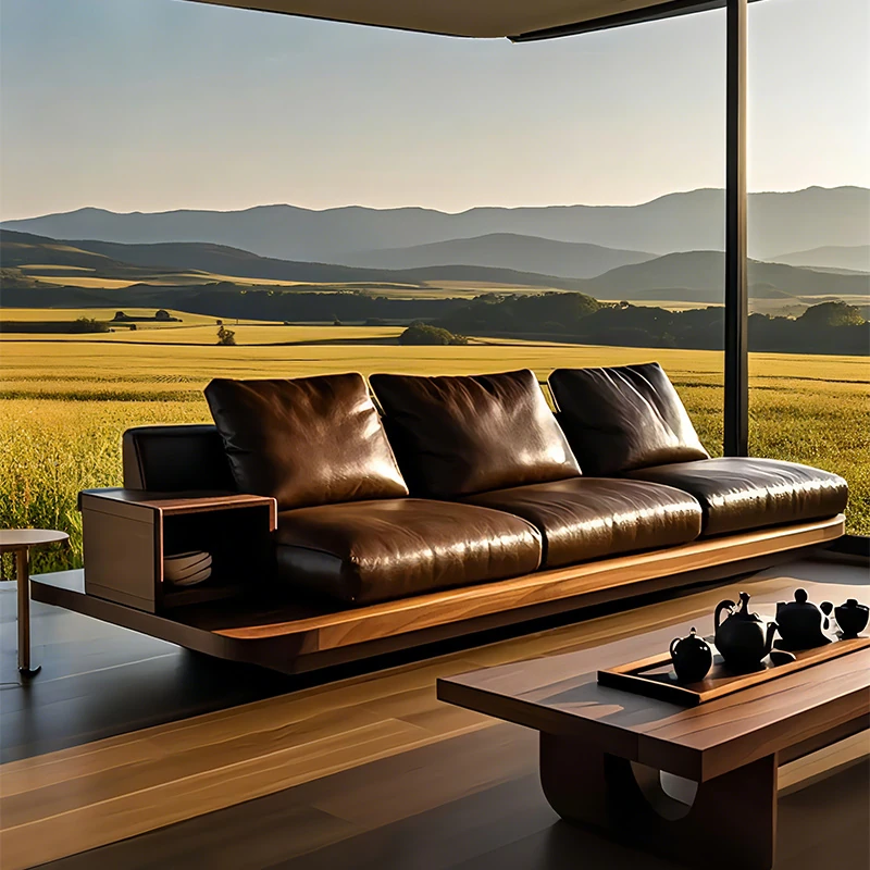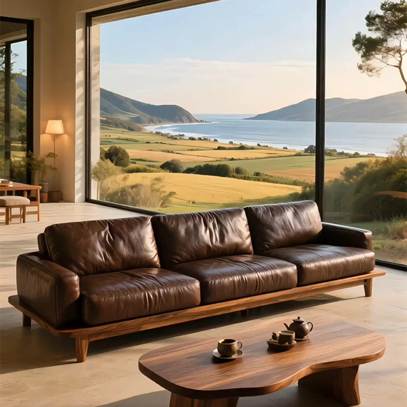 2025年新作!大户型向けのリビングソファ - 和モダンの美しさを追求した本革製の高級木製ソファ。ウォールナット材を使用し、心落ち着く禅の雰囲気を演出。贅沢な居心地を実現した、あなたの理想の空間を彩ります!