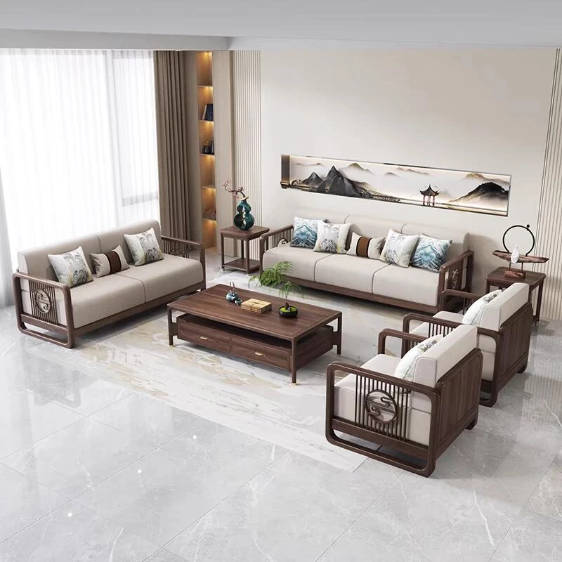 2025年新作!新中式実木ソファ - モダンでシンプルなデザイン、ラグジュアリーな雰囲気を演出するウォールナット製。快適なリビング空間を実現する高級感あふれるアイテム!