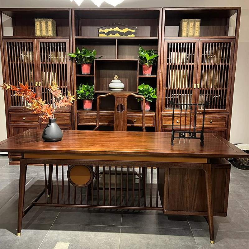 2025年新作 高級感あふれる新中式デザインの木製パソコンデスク - ウォールナット仕上げのオフィス用書斎デスク