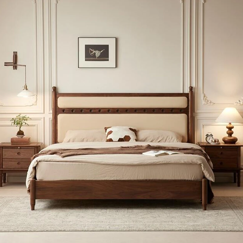新中式スタイルの無垢材ベッド2025年新作!モダンでシンプルなデザイン、主寝室にぴったりな婚礼用ダブルベッド。高級感あふれるウォールナットの皮革仕上げで、快適な眠りをお約束します。