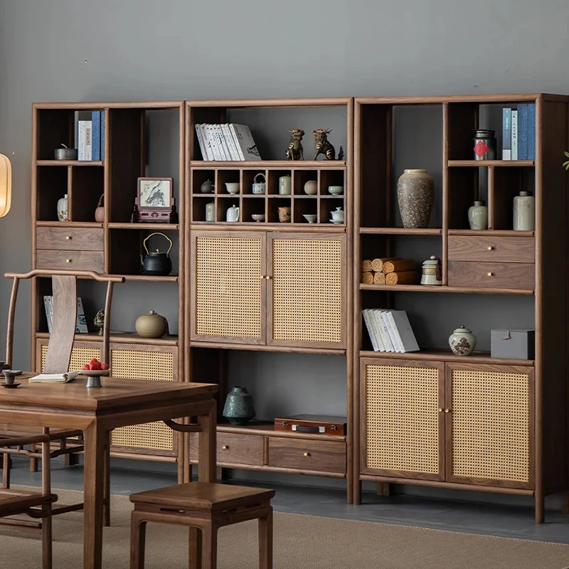 2025年新款中式胡桃木书柜 - 优雅博古架设计,完美展示茶饼与书籍,实木结构,提升茶室格调与品味,理想的家庭装饰选择!