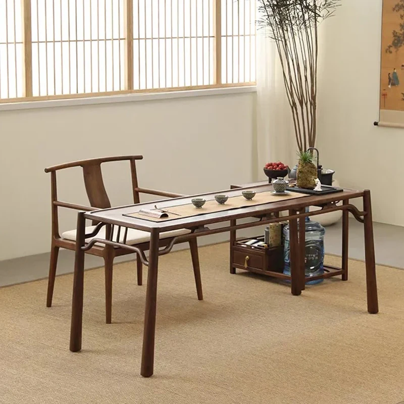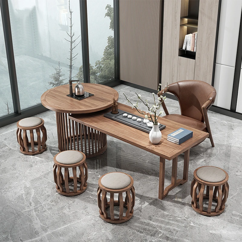 新中式デザインの実木製功夫茶テーブルセット - 高級ブラックウォルナット材使用、オフィスでもリラックスしたひとときを。茶道を楽しむための理想的な茶席!