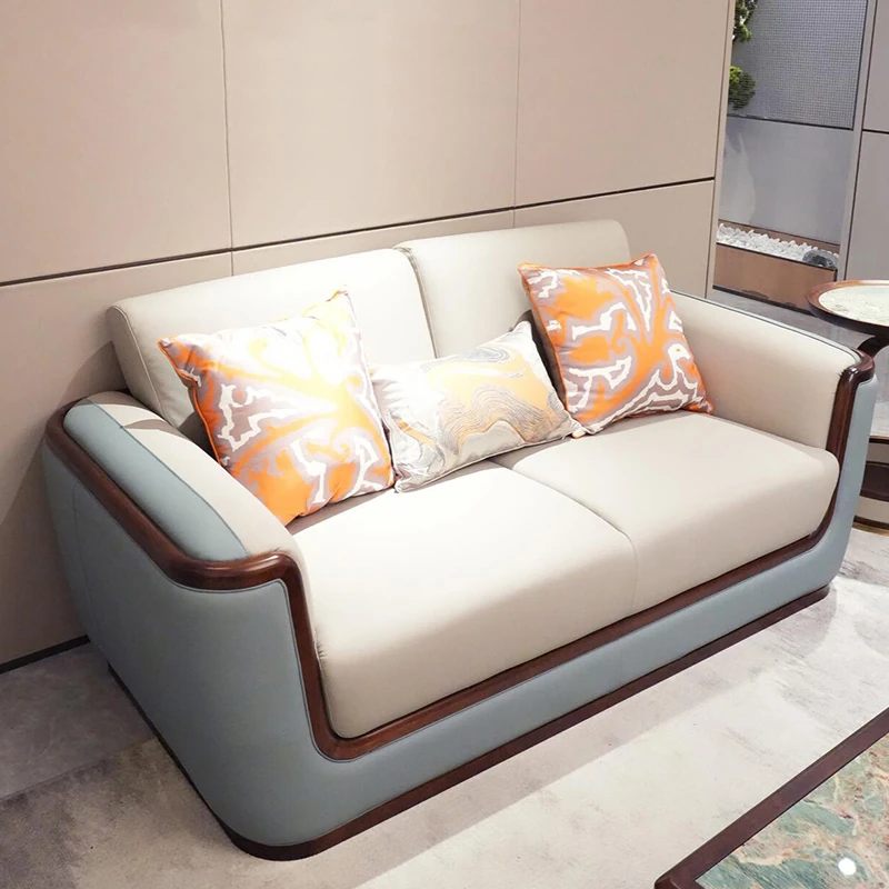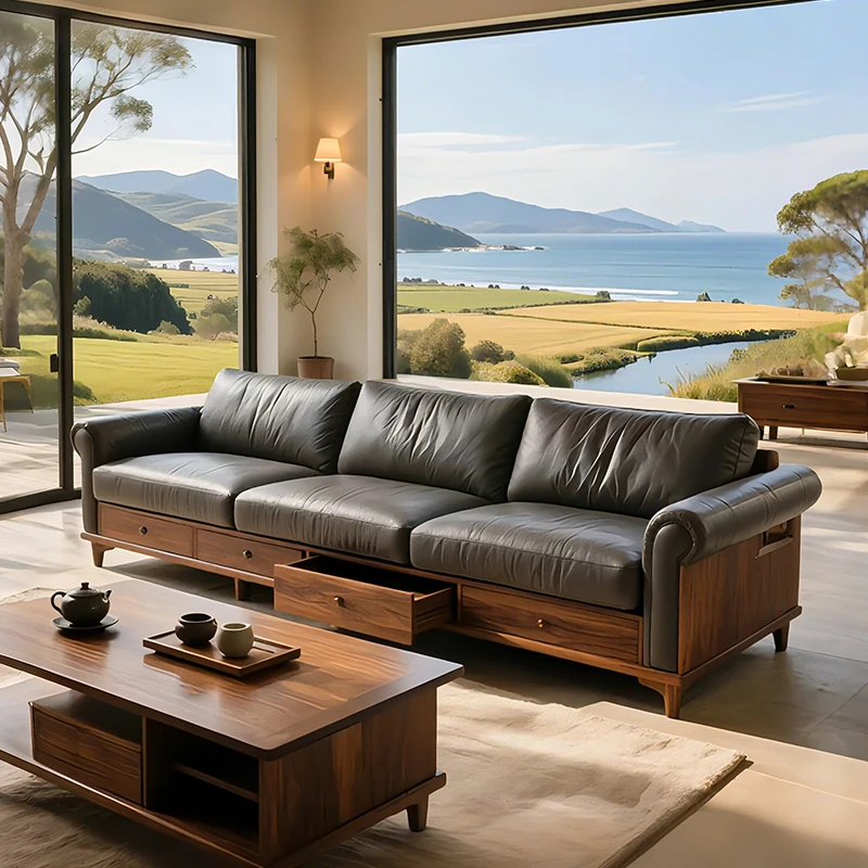 2025年新作!高級感あふれる新中式ソファ—リビングルームにぴったりの木製&レザーコンビ!ウォールナット材使用で、居心地の良い休息スペースやオフィスの接待にも最適。快適さとスタイルを両立した一品!