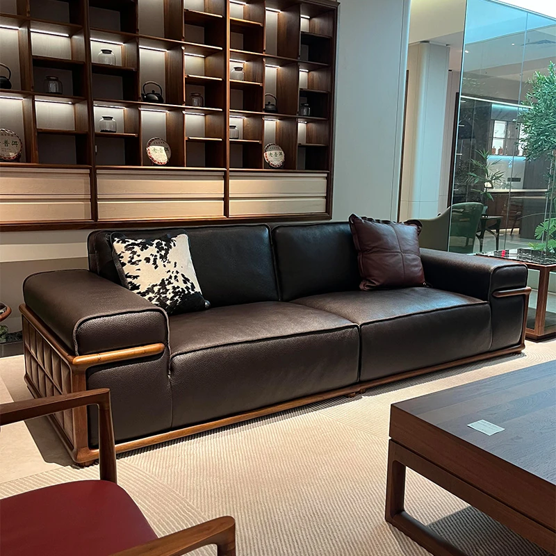 新中式スタイルのリビングソファ2025年新作!広々とした家や別荘にぴったりの実木&レザー仕上げ、ウォールナットの高級感あふれるソファで、ゲストをお迎えするのに最適です。おしゃれで快適な空間を演出します!