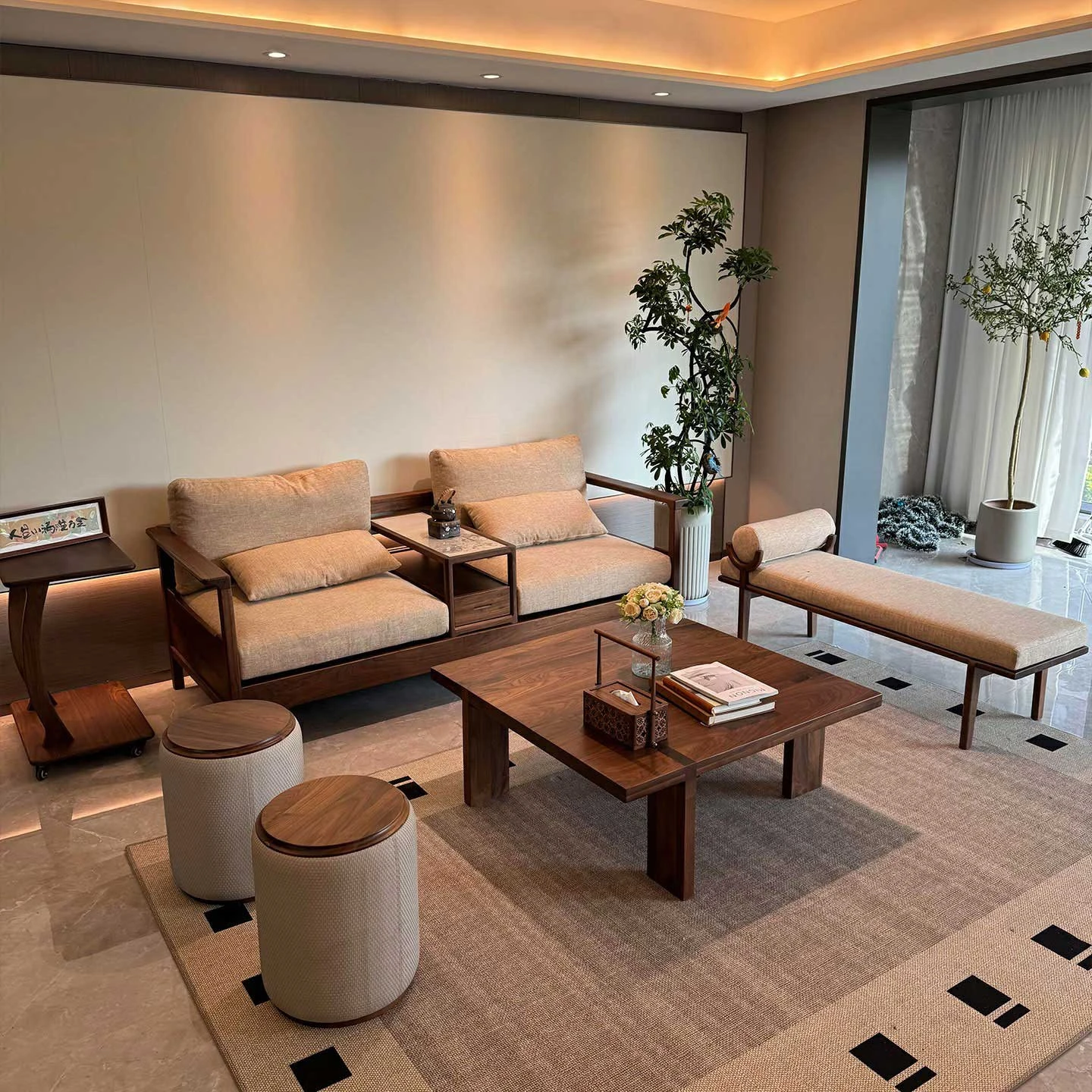2025年新作!モダンでシンプルな布製ソファ、リビングにぴったりの実木製新中式デザイン。ウォールナット材の123コンビネーション、スタイリッシュなモデルルームに最適!