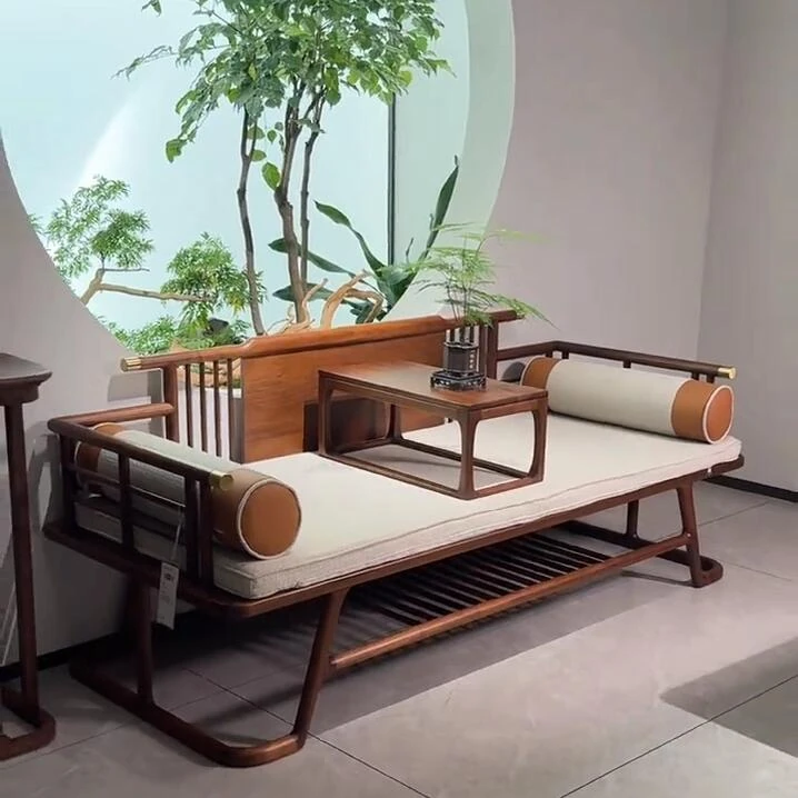 2025年新作!新中式ロハンベッドスタイルの現代的でシンプルなリビング用ソファ。高品質な無垢材使用、3人掛けの直排デザインで、上品な空間を演出します。心地よいひとときをお楽しみください!