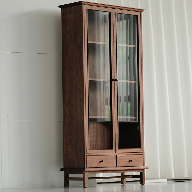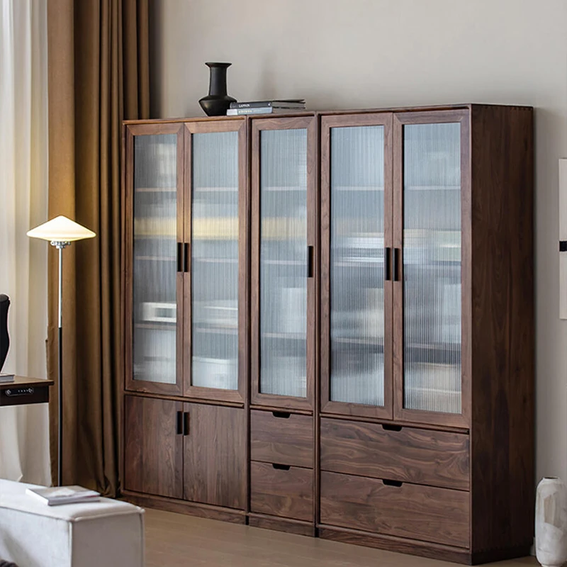 新中式スタイルの書棚2025年新作!モダンでシンプルなデザイン、リビングやオフィスに最適な天然木とガラス扉の本棚。ウォールナット材使用で高級感溢れる一品です。
