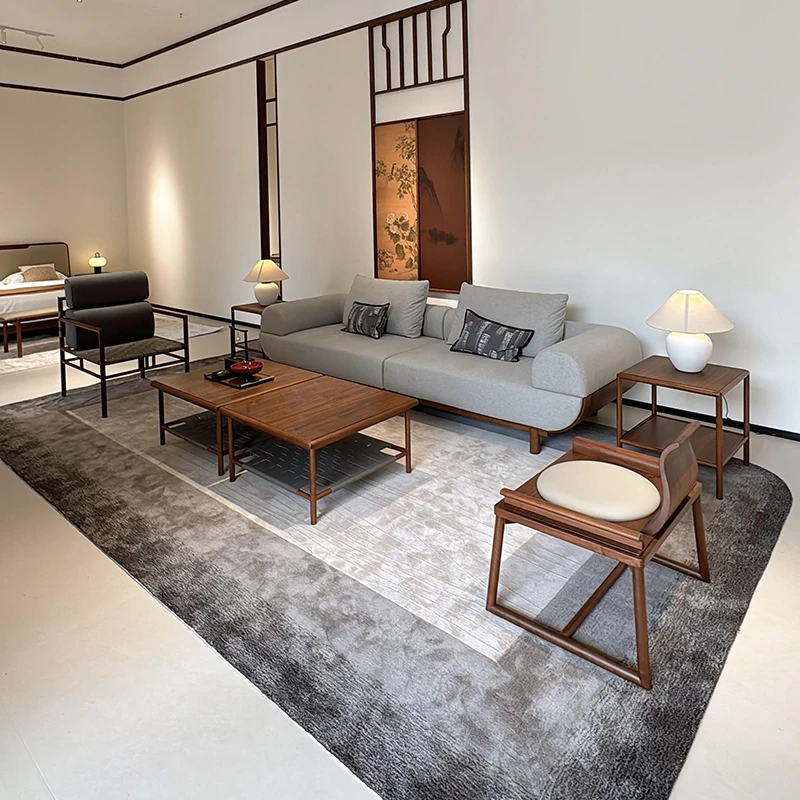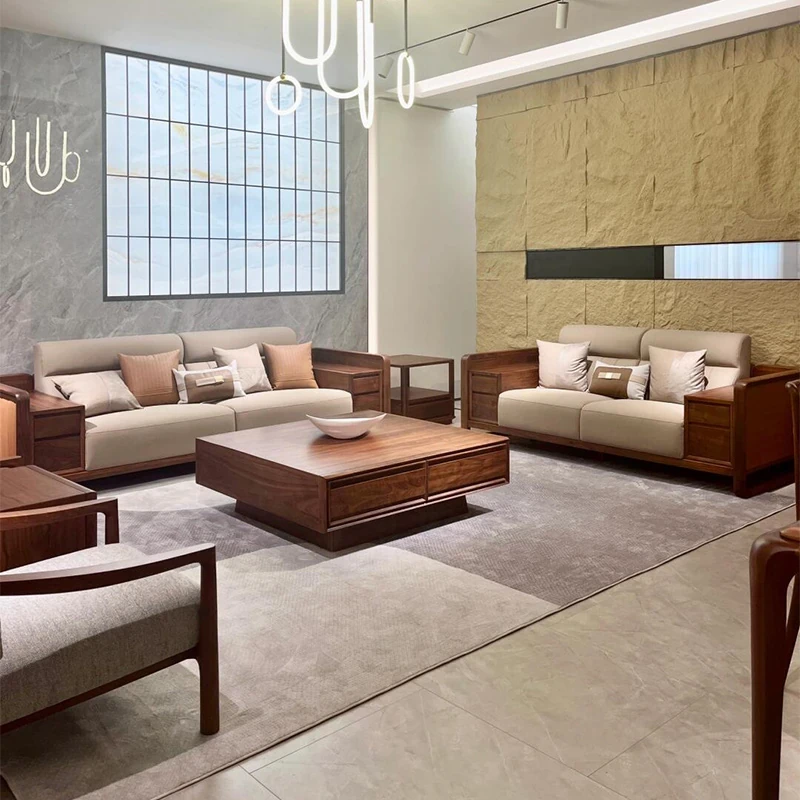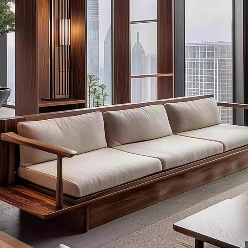 新中式スタイルの無垢材ソファ2025新作|モダンでラグジュアリーな高級感溢れるリビング用ブラックウォールナットソファ|接待室にも最適!