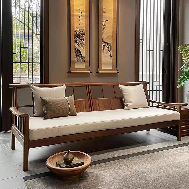 2025年新作!新中式実木ソファー - モダンでシンプルなデザイン、ウォールナット材の3人掛けリビングソファ。快適さとスタイルを兼ね備えた、あなたの家にぴったりの一品!