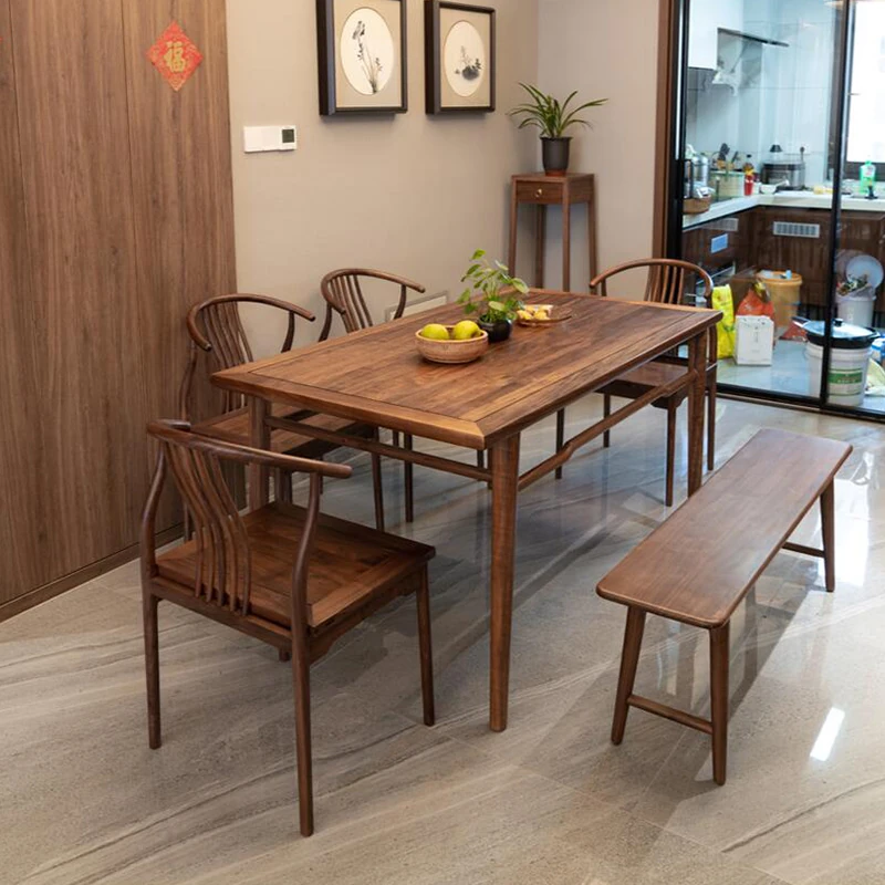 2025年新作・新中式スタイルのシンプルでラグジュアリーな無垢材ダイニングテーブル|小さなリビングに最適なウォールナット製テーブルで、上質な食事空間を演出します。