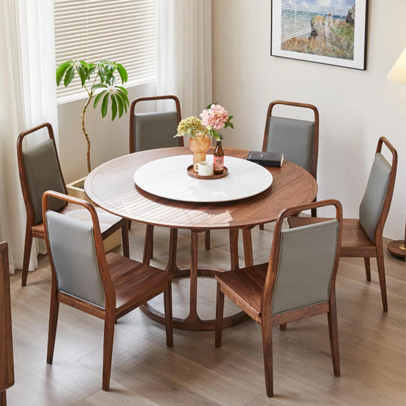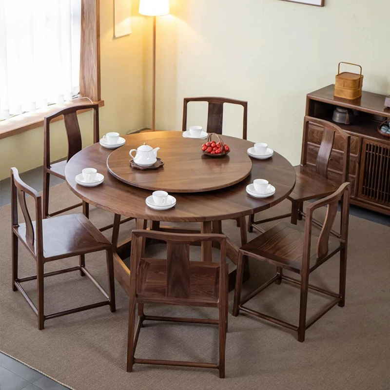 新中式デザインのラウンドテーブル - ウォールナット材使用、モダンで軽やかな贅沢感!家庭用に最適な実木製の円形ダイニングテーブル、木製ターンテーブル付きで、食事をもっと楽しく!