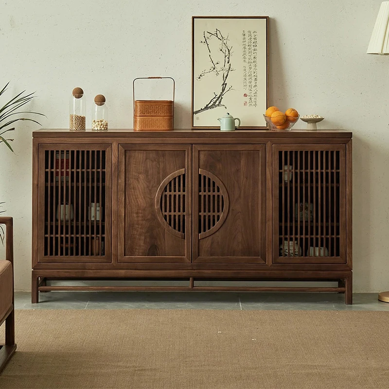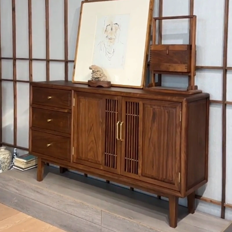 2025年新作!新中式実木ダイニングサイドキャビネット - モダンでシンプルなデザイン、中古風のクルミ材を使用した収納力抜群のリビング用キャビネット!おしゃれで機能的なお部屋作りに最適です。