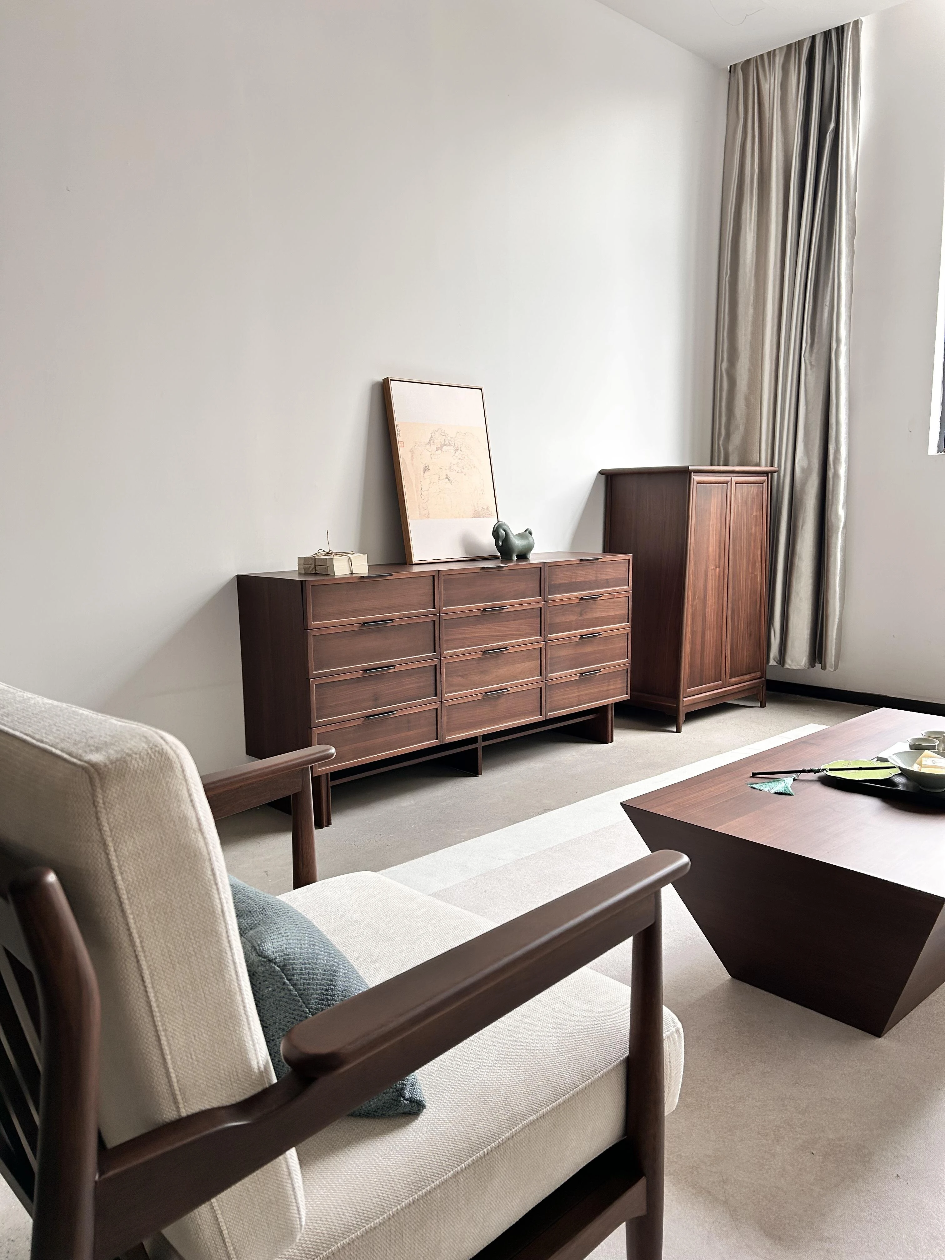 2025年新款・新中式・天然木材使用のモダンシンプルなリビング収納キャビネット・ウォールナット色・スタイリッシュな収納力を誇る家具!お部屋を美しく整理整頓し、上質な空間を演出します。