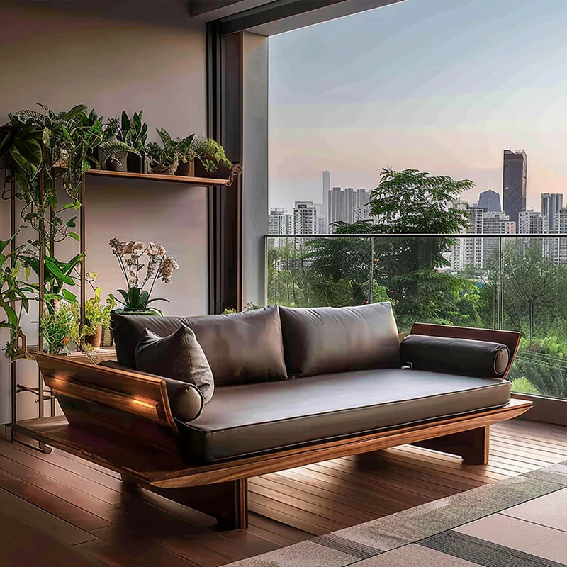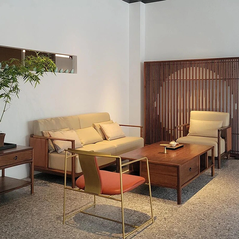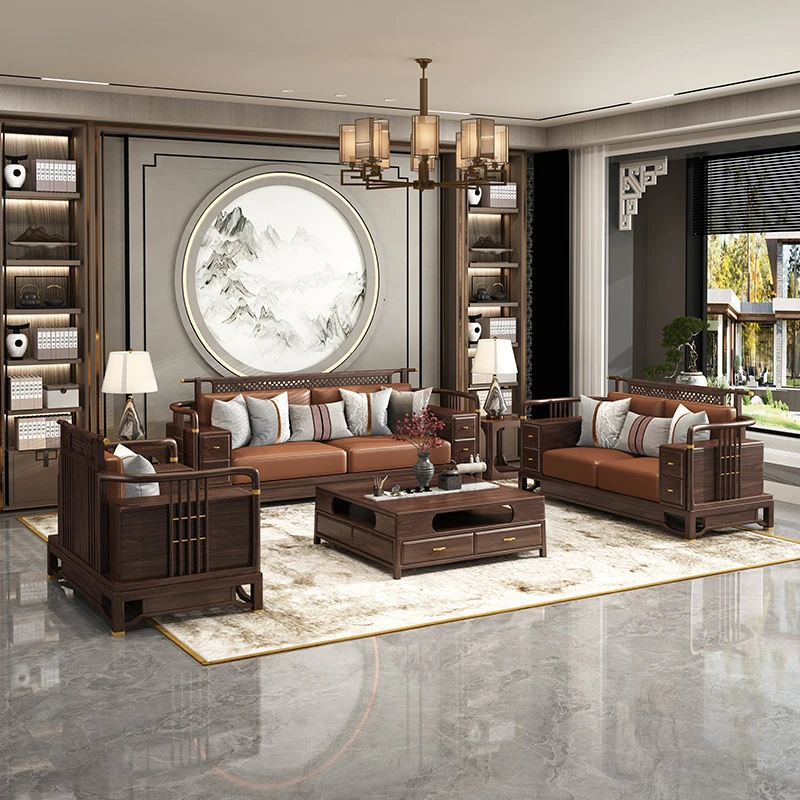 2025年新作!シンプルで洗練された新中式ソファー。高級感溢れる無垢材と本革仕上げ、ブラックウォールナット使用。高級ヴィラのリビングにぴったりな逸品です!