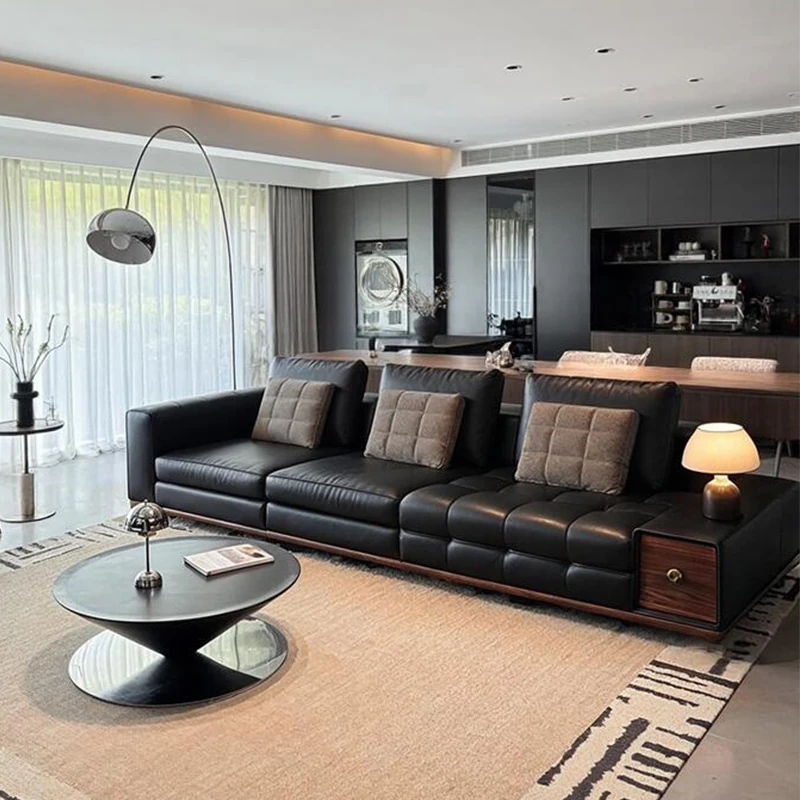 2025年新作!モダンミニマリストデザインの高級レザーソファ。イタリアンスタイルの家庭用直線型ソファ、ウォールナット材の温もりを感じる接客用ソファ。洗練された空間を演出します!