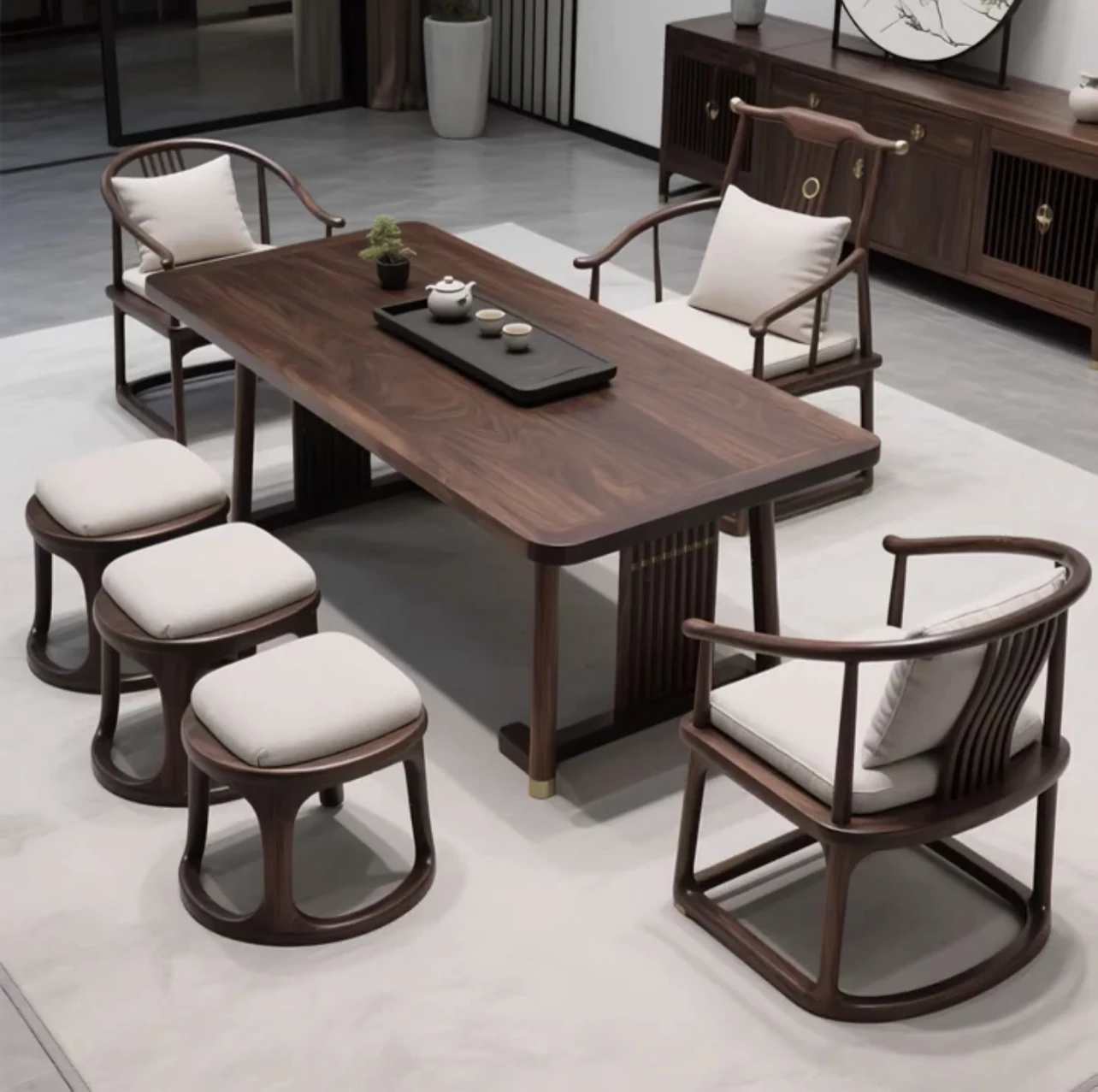 2025年新作!新中式実木製茶卓と椅子のセット - モダンでシンプルなデザイン、胡桃の木を使用した高品質なリビングルーム用ティーテーブル。おしゃれな空間で至福のひとときを!