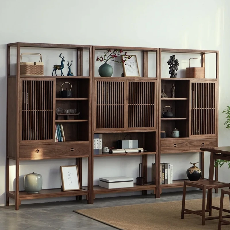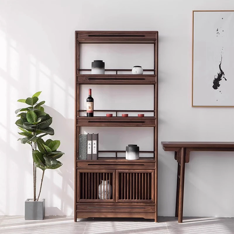 2025年新作!胡桃木のシンプルな博古架 - モダン中式の実木製ディスプレイキャビネット。茶葉や茶饼を美しく展示するための必需品!あなたの茶室にぴったりの洗練されたデザイン。