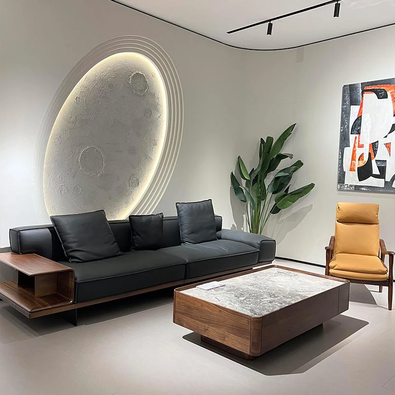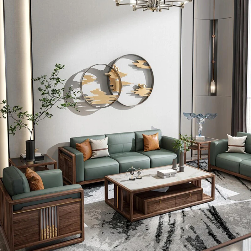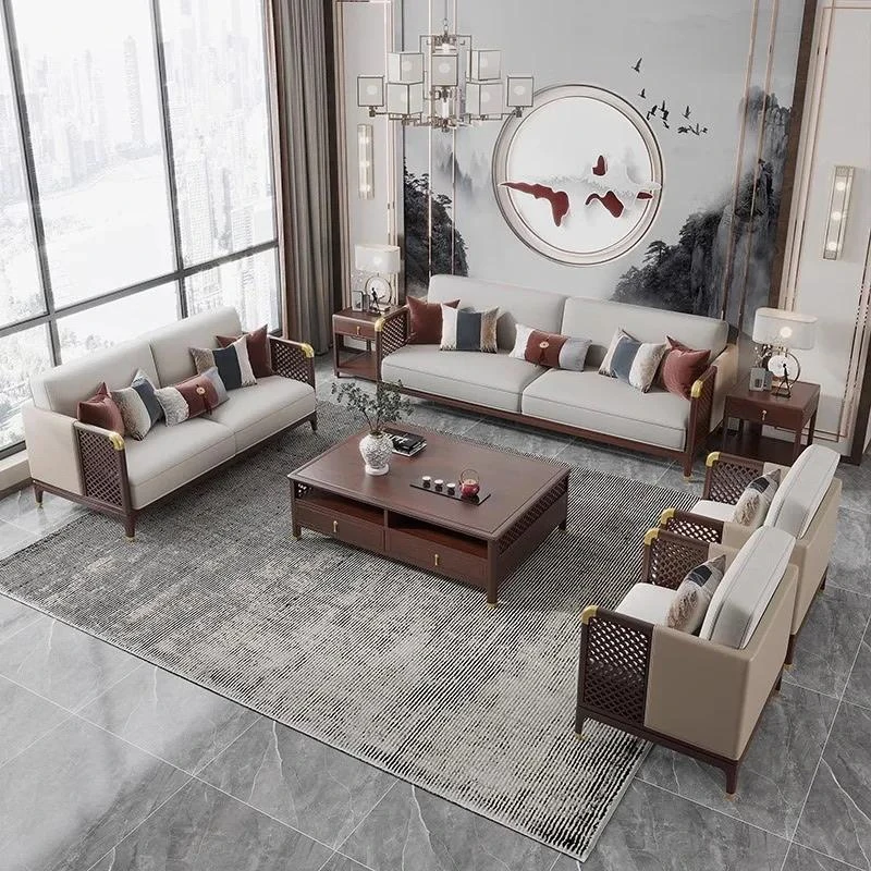新中式皮革ソファ 2025年新作 高級感あふれるクルミ材使用のリビングルーム向け別荘スタイル 軽やかな実木ソファセット
