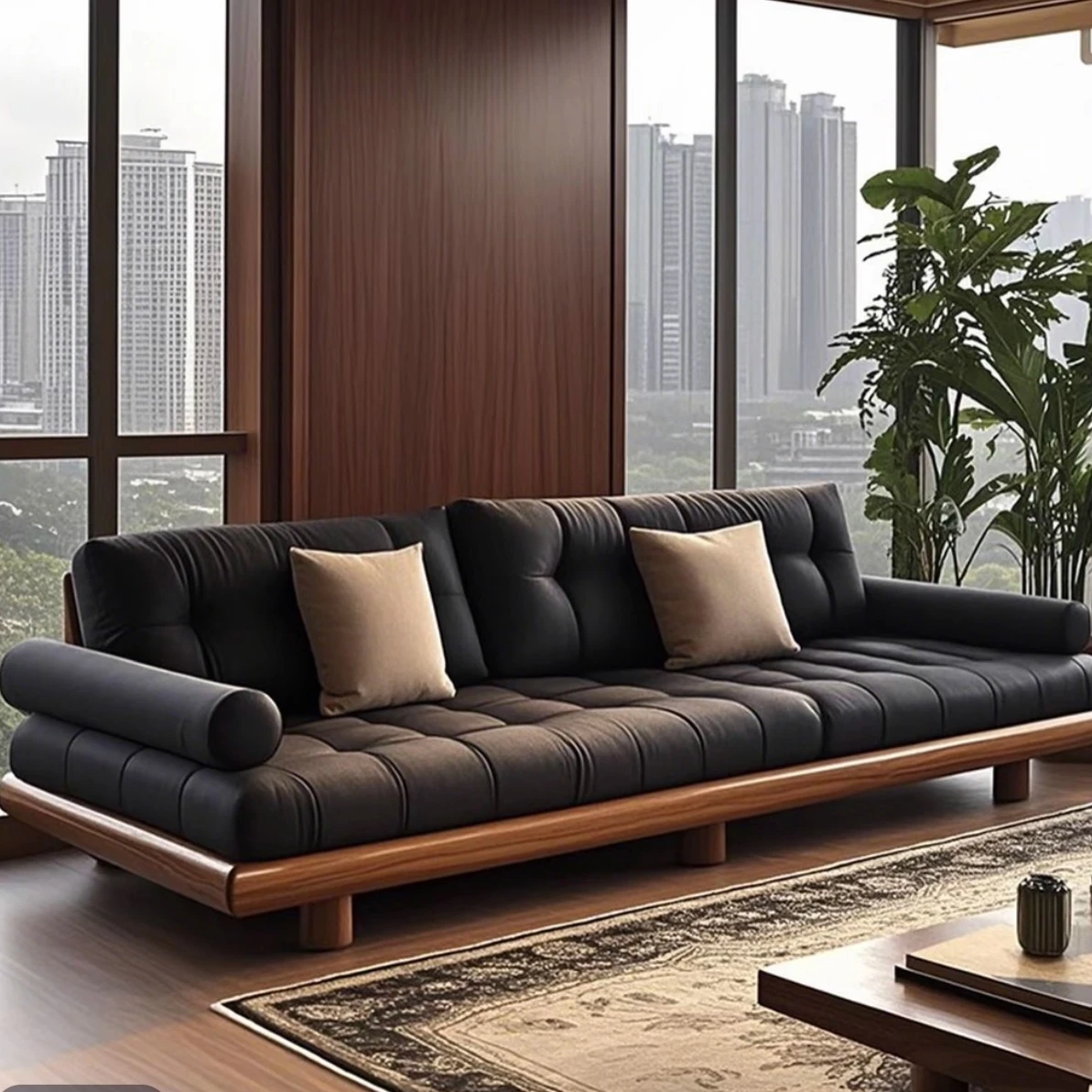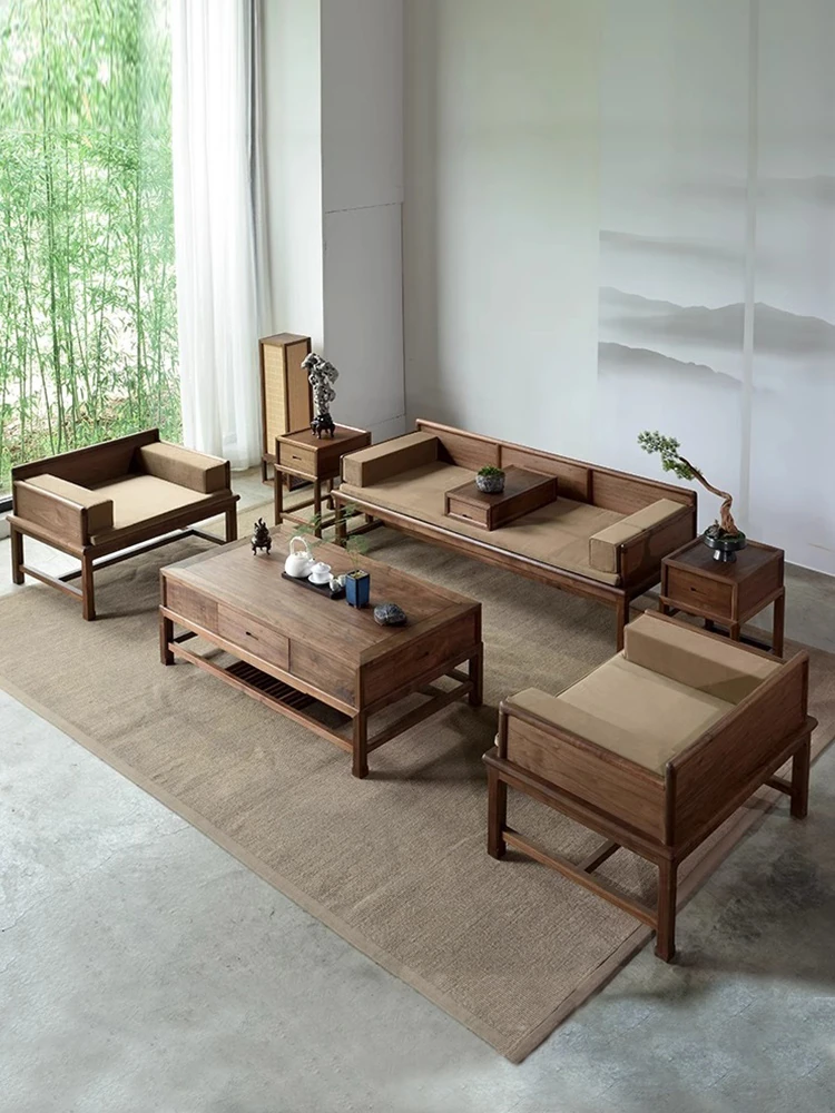 新中式スタイルのリビングルーム用ロハンベッドソファセット - 北米産ウォールナットの無垢材を使用したデザイナーズ禅スタイルロハンカウチ。心を落ち着ける癒しの空間を演出します!