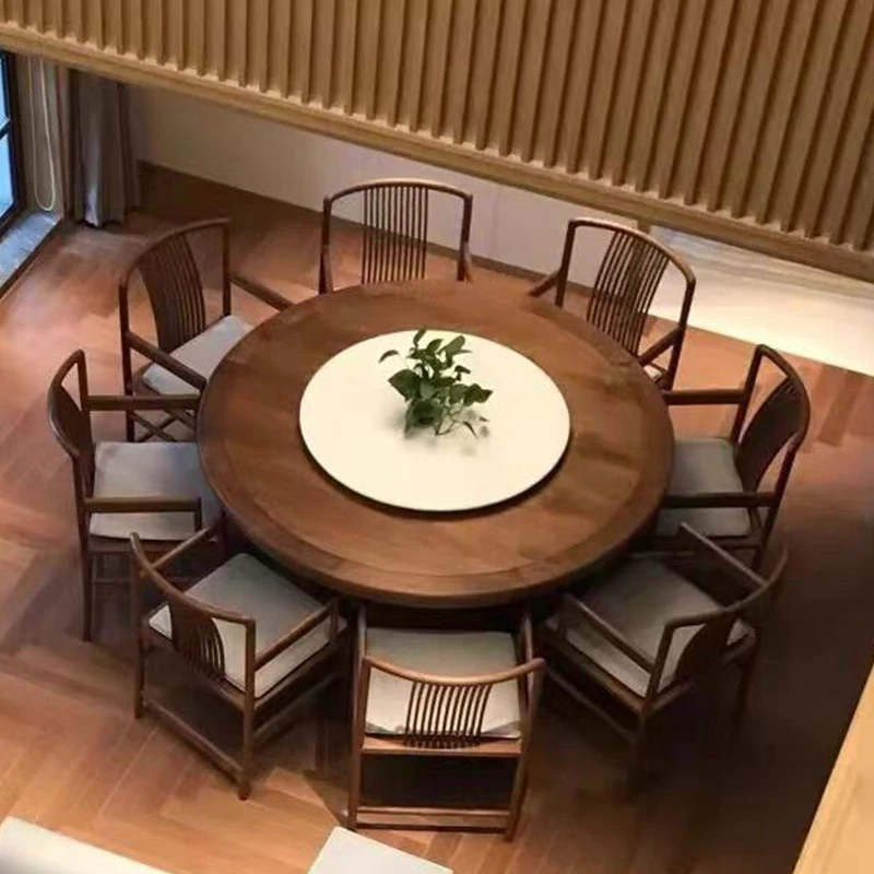現代的シンプルでラグジュアリーな新中式デザインのウォールナット材製丸テーブル。リビングや家庭に最適な実木製の円形ダイニングテーブル、岩板の回転トレイ付きで、食事がもっと楽しくなります!